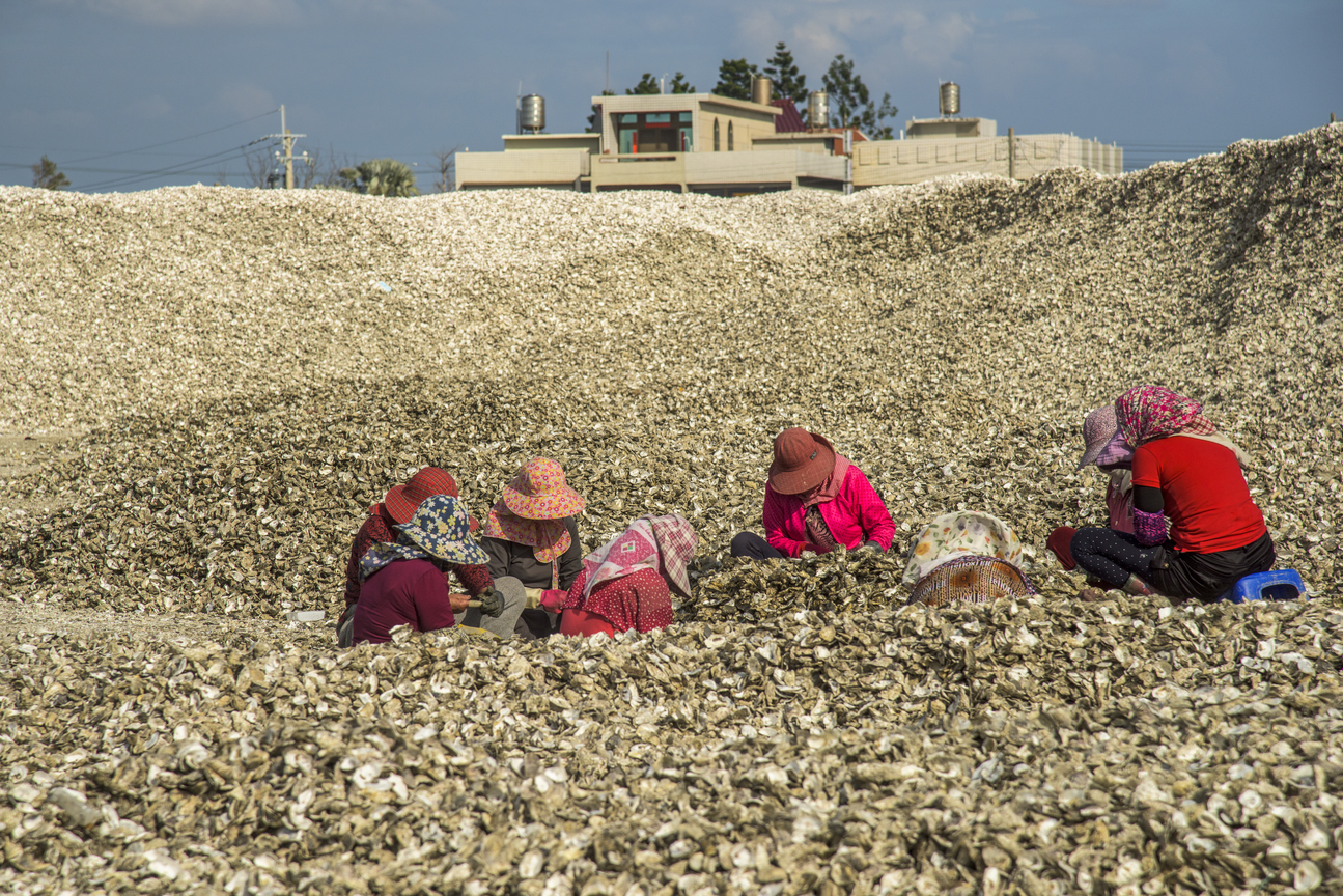 這些農婦在滿堆的蚵殼中撿拾遺漏掉的鮮蚵,優閒的午後就在聊天工作下度過了。
