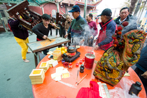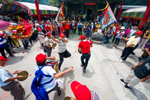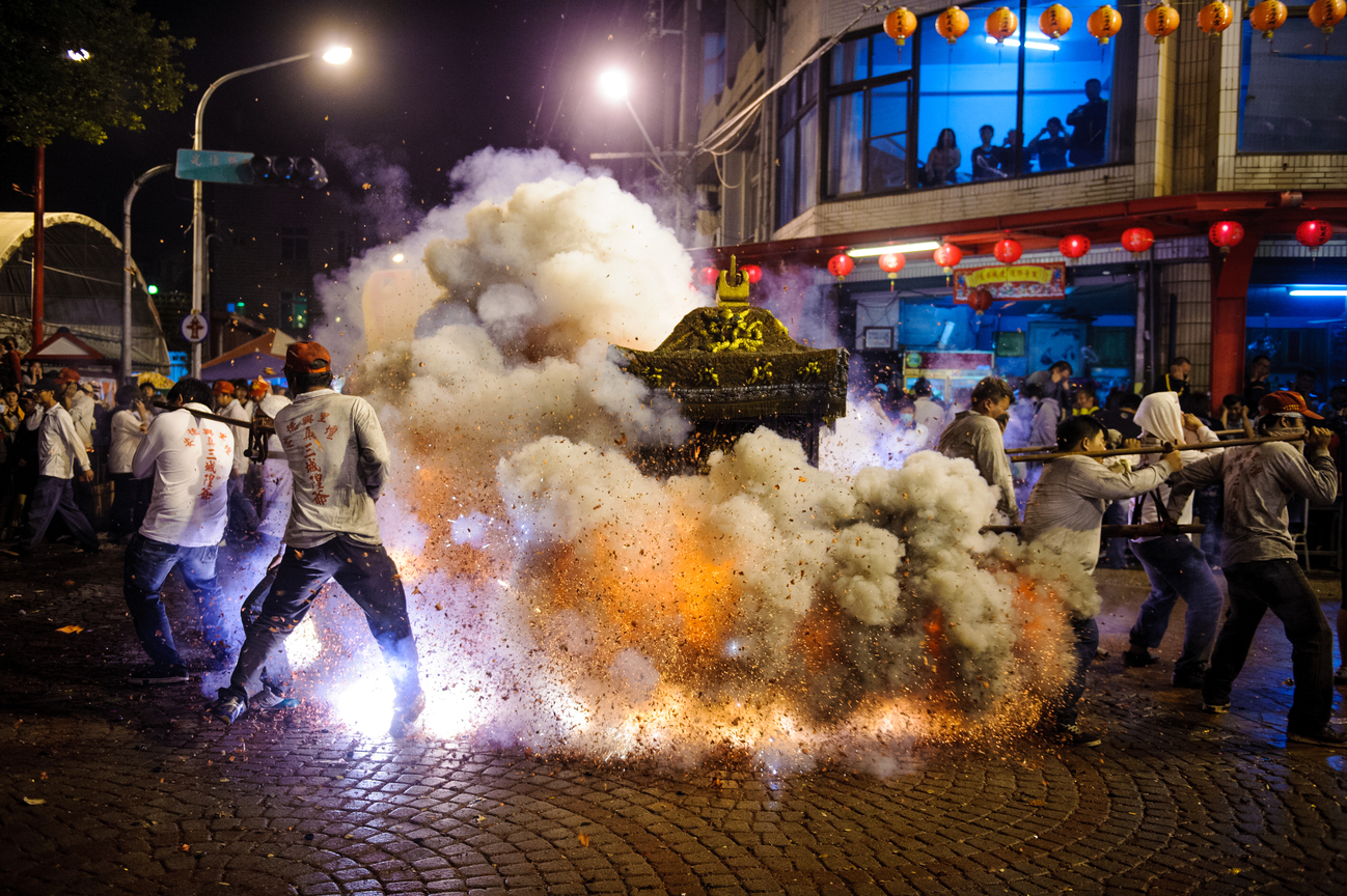 誠心的信徒們不畏爆竹.在煙火中為神明慶生.