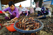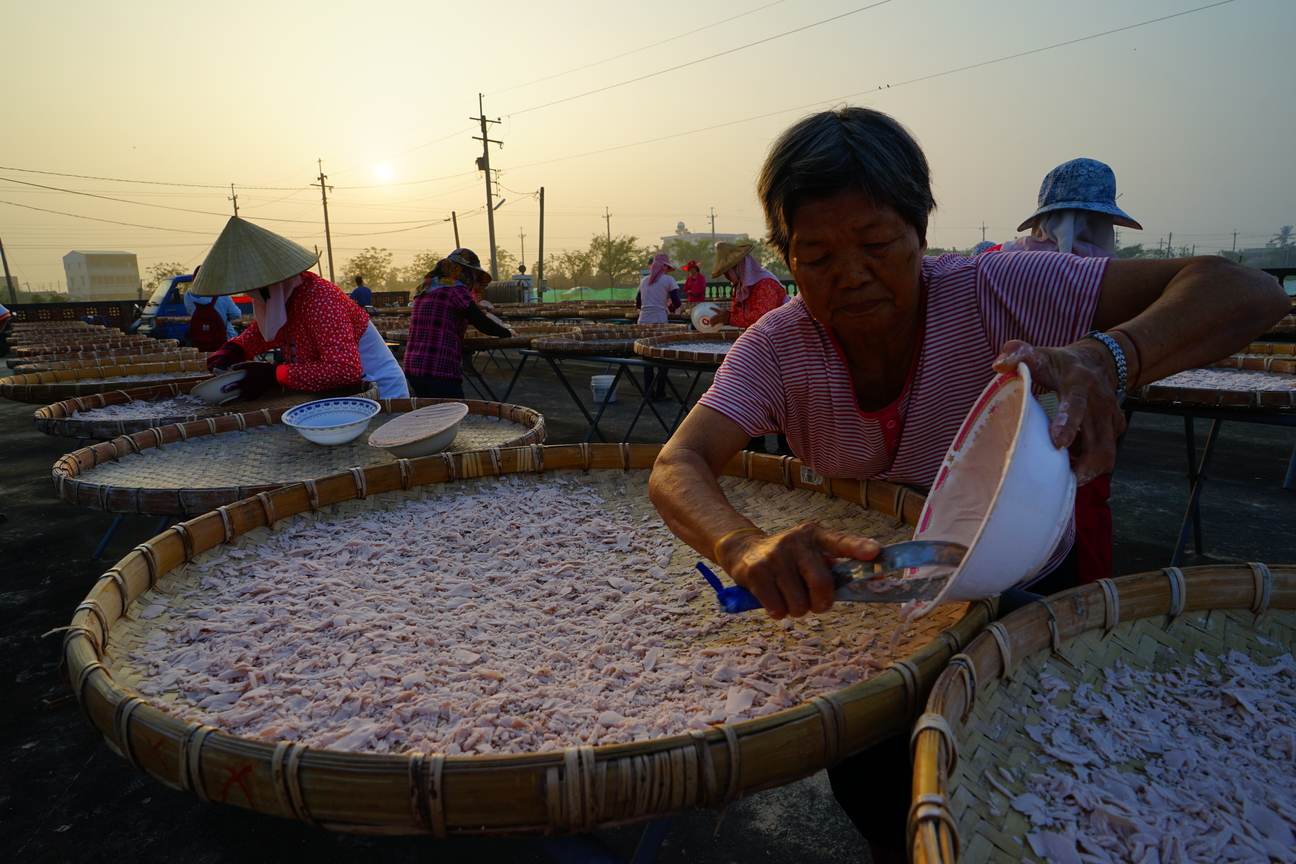 蓮鄉白河除了美麗的荷花,還有製作非常費工的蓮藕粉。 從挖起粉藕、絞碎、洗漿、沉澱凝固後,用特製的鋼匙刮成片狀在太陽下曬乾,全靠人工啊! 隨著農村人口老化,刮粉的多是七、八十歲的阿婆,清晨鋼匙敲著碗公的叩叩聲此起彼落,太陽慢慢爬上來,阿婆們話著家常,額頭上的汗水也靜靜地滑下。