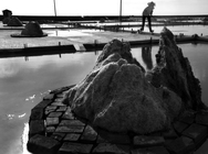 在烈日下,鹽工們不停地把堆起來了鹽,一鏟一鏟的鏟入獨輪手推車中。