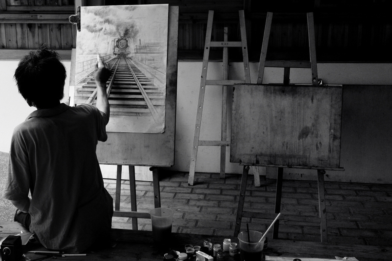 這是一位在虎尾驛前作畫的畫家,畫出他心中虎尾驛的樣貌,以及當年火車在虎尾鐵橋上疾駛的模樣。 即便現在鐵橋上已不再有火車行駛,但在那位畫家的心中,該鐵橋仍然充滿著生命力。
