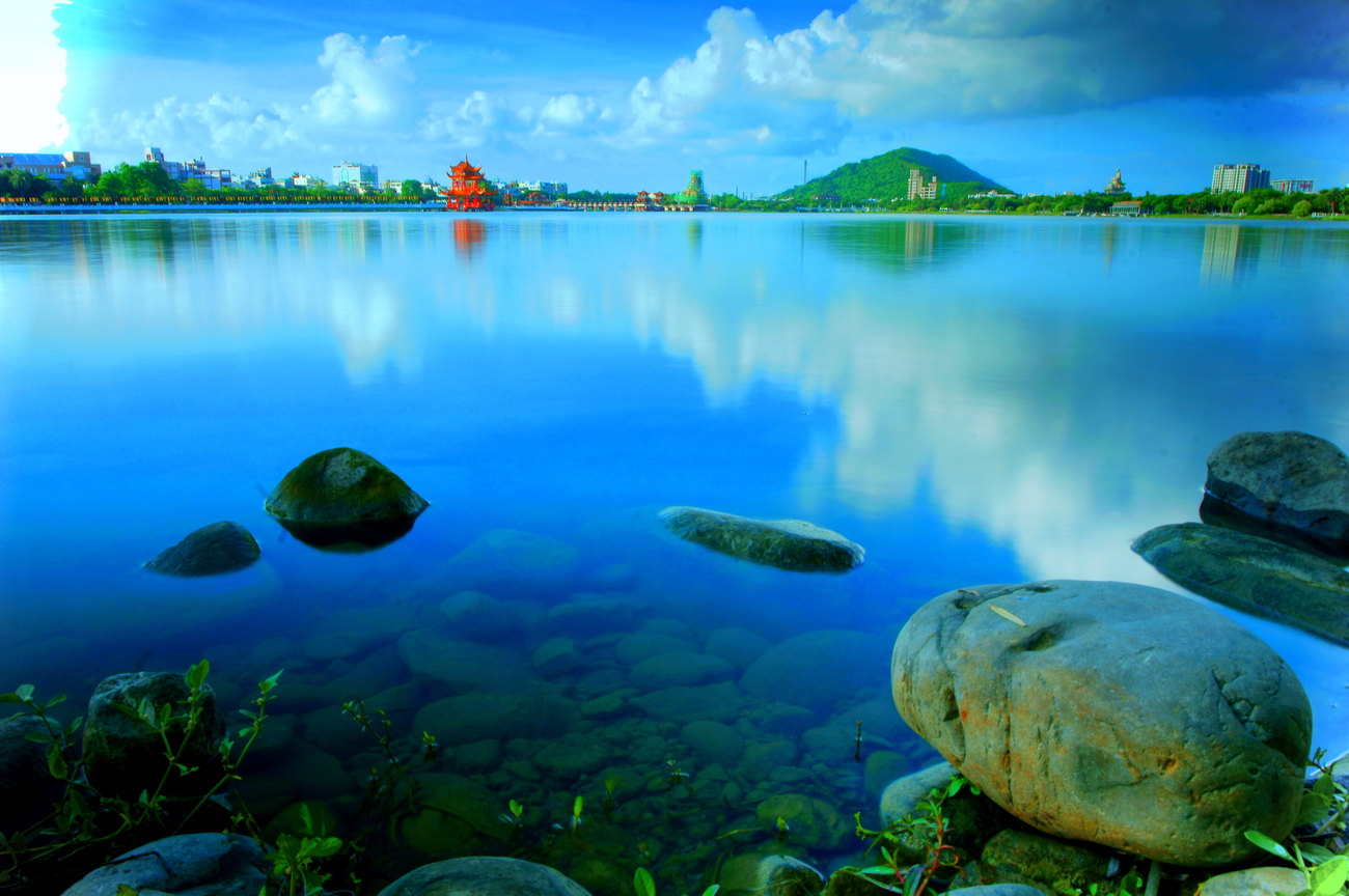 日期:2012/07/15 攝影者:楊智強 蓮池潭風光明媚、水域廣闊,南近小龜山、北接半屏山,潭長1.4公里、寬約400公尺,風景點有春秋閣,龍虎塔、孔廟、北極玄天上帝及蓮池潭公園,潭畔遍植垂柳,景緻秀麗是高雄市名聞暇邇的風景區。