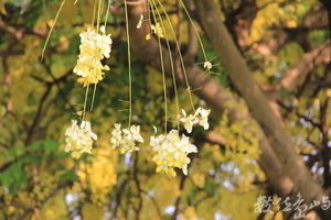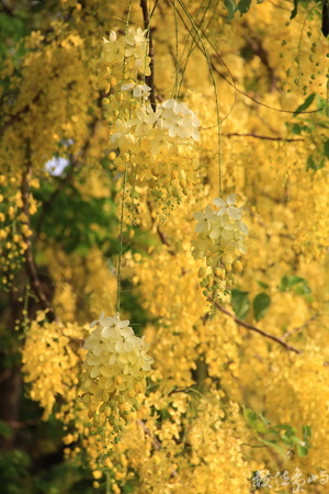 夏日在屏東市復興路台糖舊圍牆旁,所見滿樹金黃花開,一字排開的阿勃勒,在豔陽高照下,隨風飄搖,宛如成千的黃色彩蝶凌空飛舞,美不勝收,頗為吸睛。
