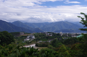 在雲中若隱若現的山。