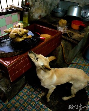 初二回娘家過年 母親忙進忙出 我在廚房裡找東西拍 菜板上放著剛從鍋裡撈出來的雞 好鼻師小黃聞香而至 直接兵臨城下 無限愛戀的仰望著無人看守的肥雞 一時拿不定主意 該動手還是直接動口 一旁的我在捕捉精彩畫面與搶救母親的雞之間交戰 結局是 母親的雞戰勝 我在小黃進一步動作的前一秒脫口制止…