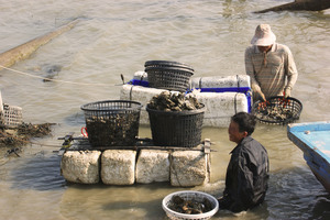 有人說養蚵人家,「人肉鹹鹹」,就是描寫養蚵人家一年四季都泡在鹽水裡辛苦工作的情況。沙洲外面是浪大水深的外海,沙洲裡面就成了浪靜水淺的內海,海底下看不見的,則是高低不平的淤沙或爛泥。對養蚵人來說,水淺的地方,可以在退潮時走過去,而機動性較強的平底小筏或小船總是比較方便,除了運載整籠整籠笨重的蚵仔省時省力,更可以在潮水初退時就搶時間下蚵田工作,一般蚵的生長過程,從掛蚵殼、放蚵苗、除蚵螺、採收蚵,泥濘及膝的蚵田裡,冬天的海水讓人發抖,夏天烈日令人酷熱,養蚵這樣苦的工作,年輕一輩已經沒有人要做,問他們會不會覺得很辛苦,他們笑笑說「習慣就好」,這樣但樂天知命的台灣生命力,不言可喻。