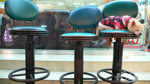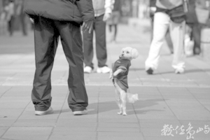 年輕氣盛的狗兒們,其之間的互動如同年輕人般,也有嬉戲玩鬧的一面;若視線再仔細往後一瞧,一位年輕人正專注望著廣告看板的女模,一動、一靜的兩個畫面相映成趣。