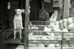 在環南市場附近的雜糧行,店家一怕外人隨意進入,二怕兇猛狗兒外出嚇著路人,便想出用三合板擋住倉庫門口這兩全其美的辦法,竟然也讓我找到這三合板的第三個好處~~營造出這狗兒好奇的可愛模樣。