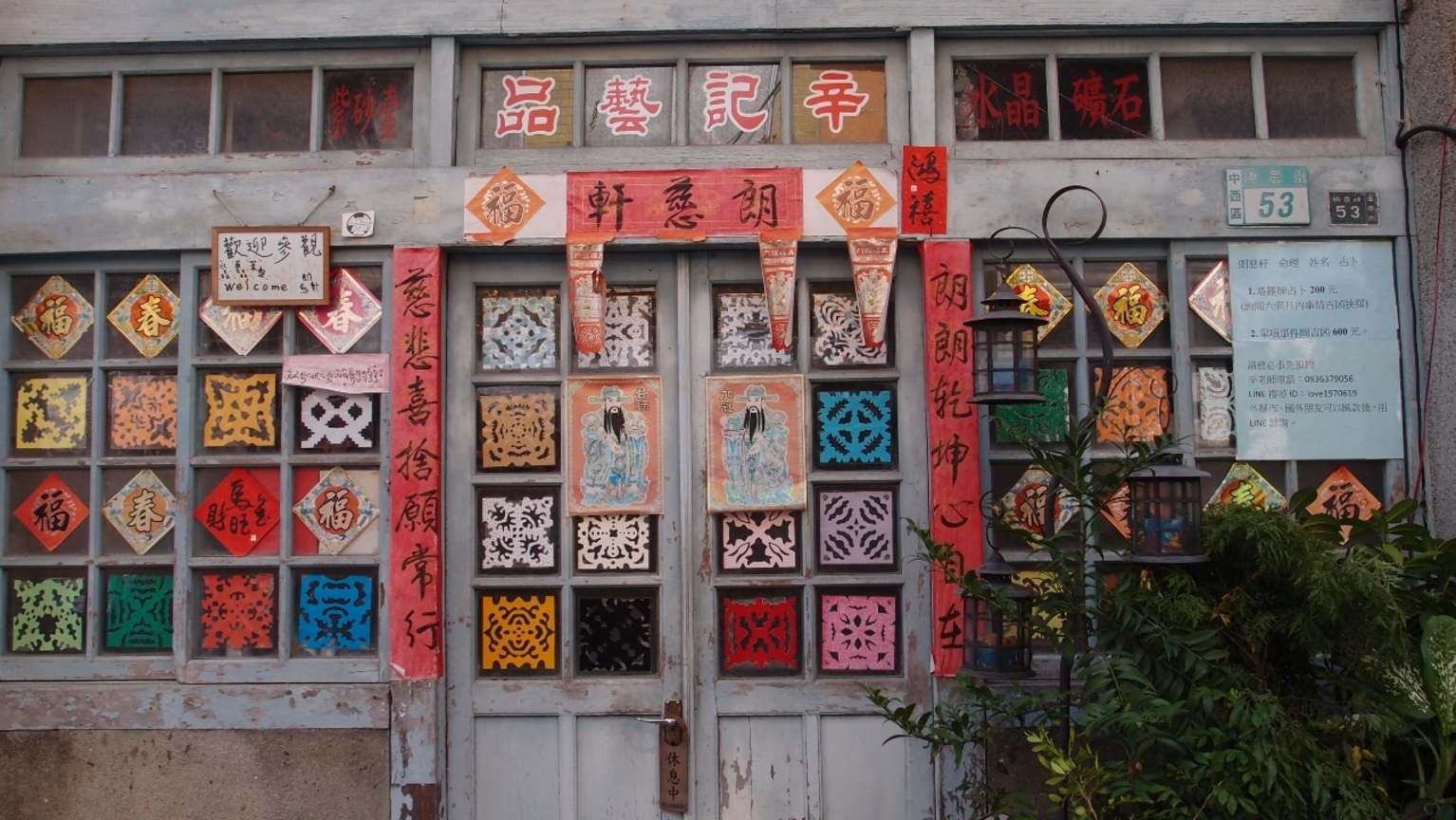 拍攝時間:2014/10/26 拍攝地點:台南市神農街 拍攝者:Jiayan 內容描述:古色古香的街道‧神農街,裡面充滿著各種老建築,放眼過去莫過於「辛記藝品」最吸引人目光,尤其是那窗戶充滿著各種剪紙和繽紛色彩。