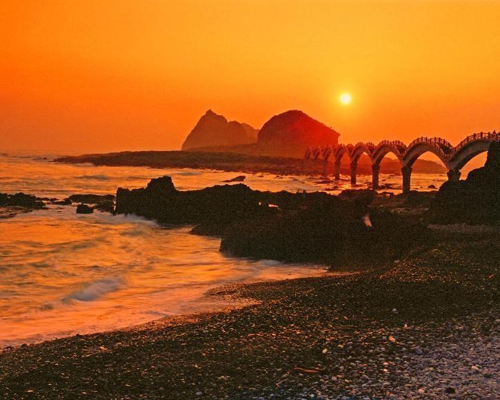 台東縣成功鎮東北方的三仙台,是東部海岸最熱門的風景區,以波浪造型呈現八拱跨海步橋,宛如一條巨龍伏臥海上,跨越至離岸珊瑚礁小島。特殊的海蝕地形,豐富的地質景觀、壯闊的海蝕與奇岩,最足以襯托三仙台光芒四射的日出,亦是東海岸絕佳美景。 |
