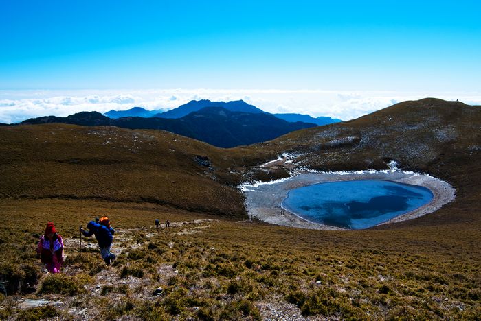「天使的眼淚」一個夢幻美麗的名字,指的就是位在中央山脈主稜上最大的高山湖泊─嘉明湖。嘉明湖為一橢圓形高山湖,傳說是因隕石撞擊而形成。在晴朗的藍天下,綻放出一池的湛藍,尤其是在早晨日出時刻,就像是鑲嵌在碧綠草原上的藍寶石。 |