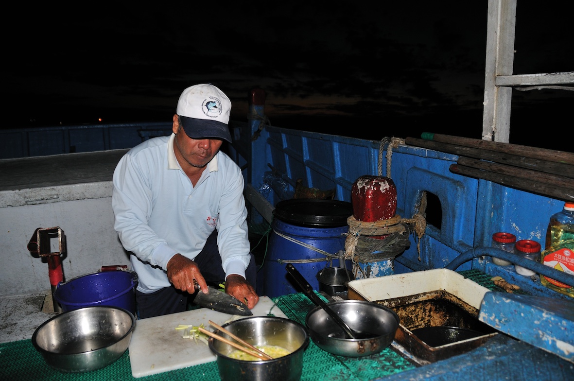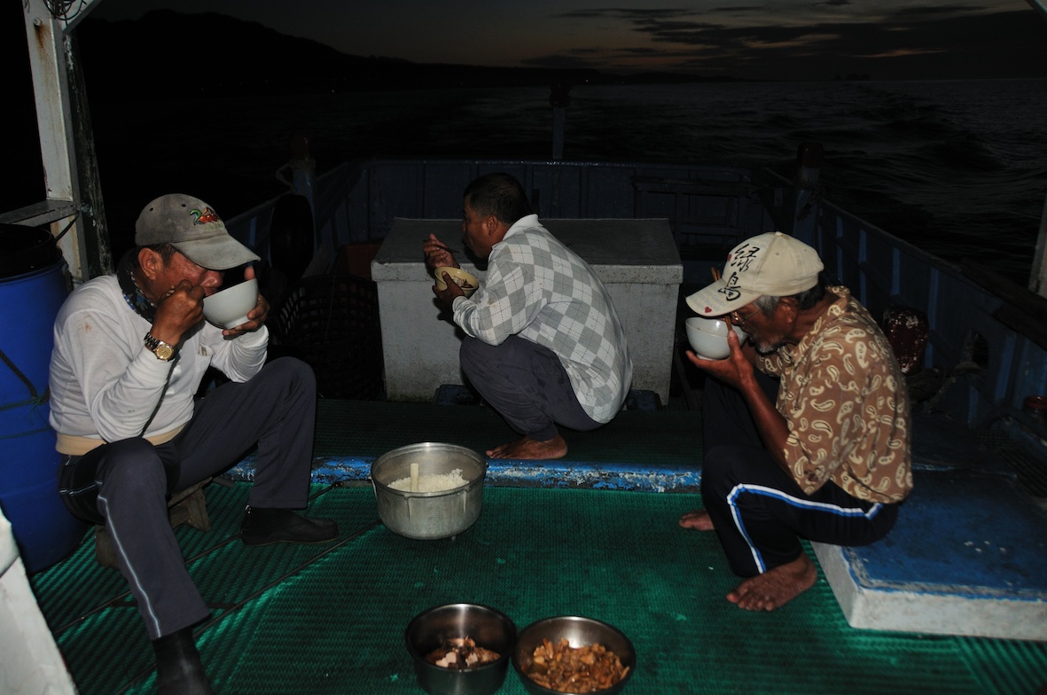 夏天風浪較為平順,可以利用出港航行的途中吃早餐,簡單的兩三道菜就是漁夫一天體力的後盾。早餐剩下的飯菜也可能留作午餐,因為待旗魚漸漸浮現之後,就是全神貫注、分秒必爭的緊湊工作,省下煮飯的人手和時間也是相當重要的一件事。