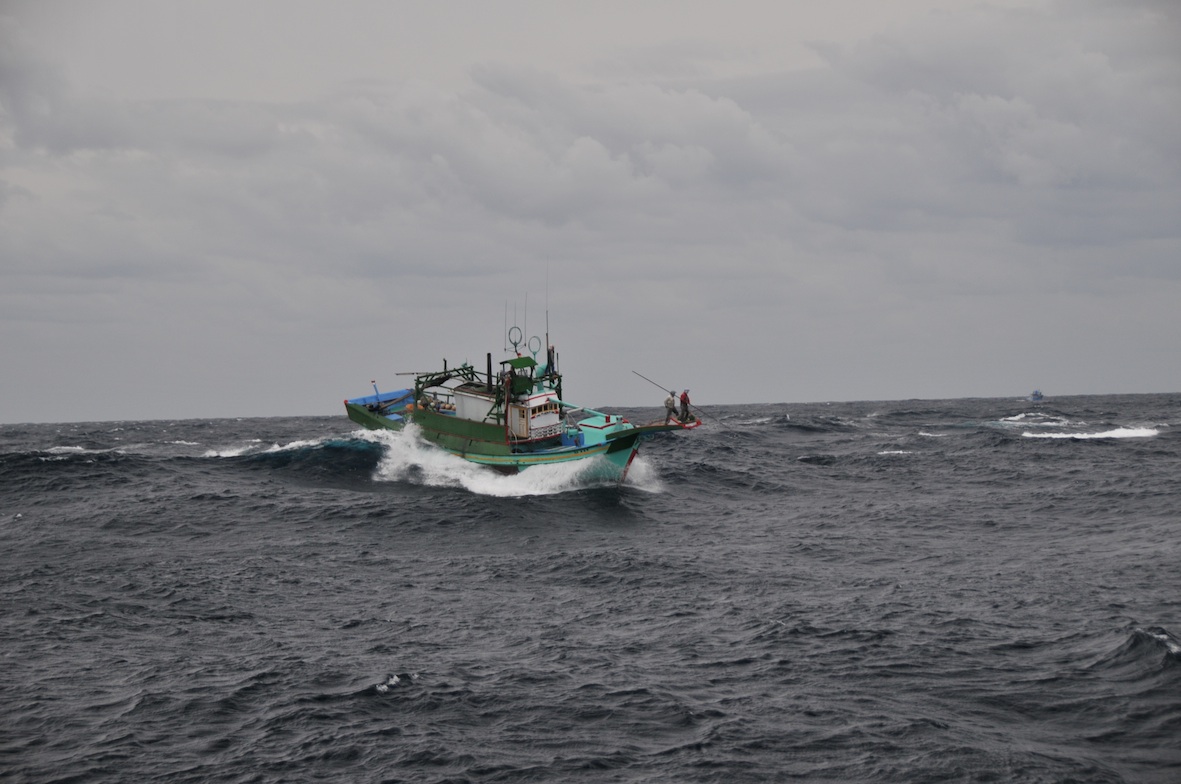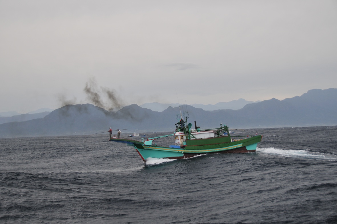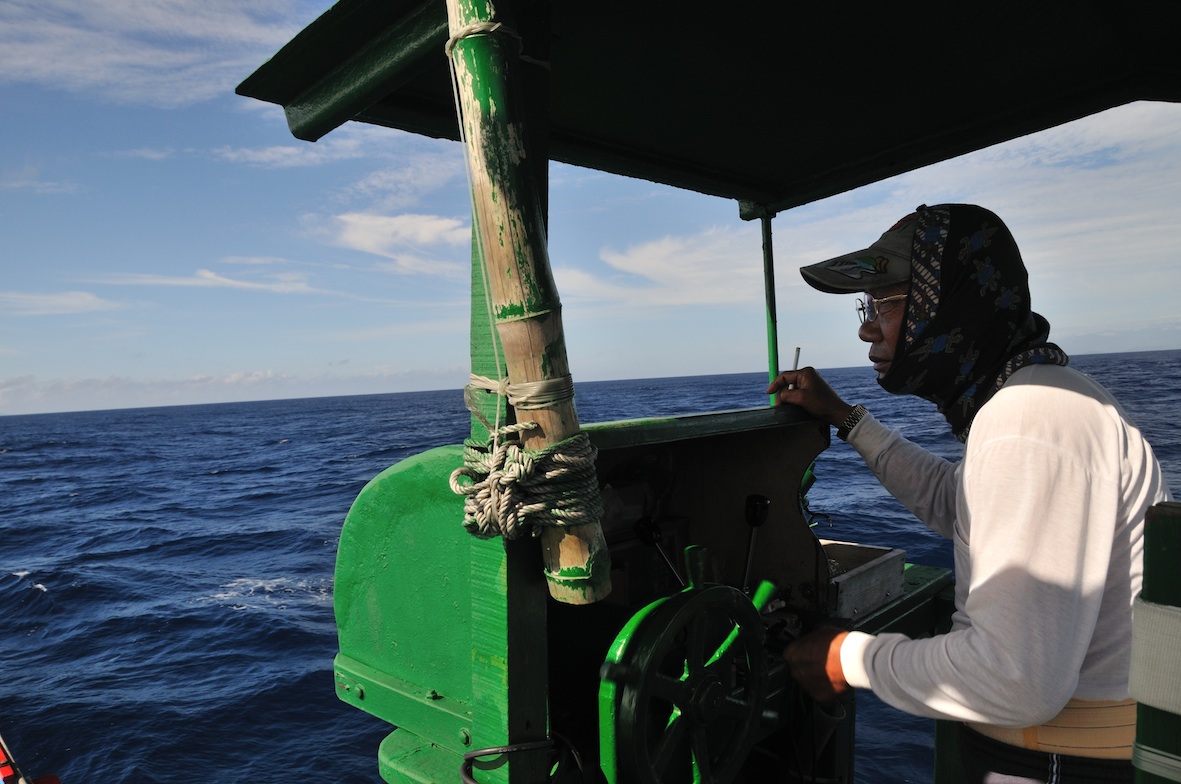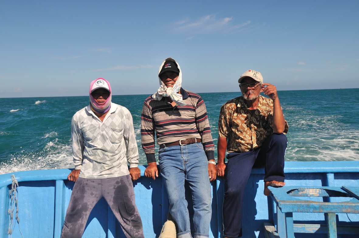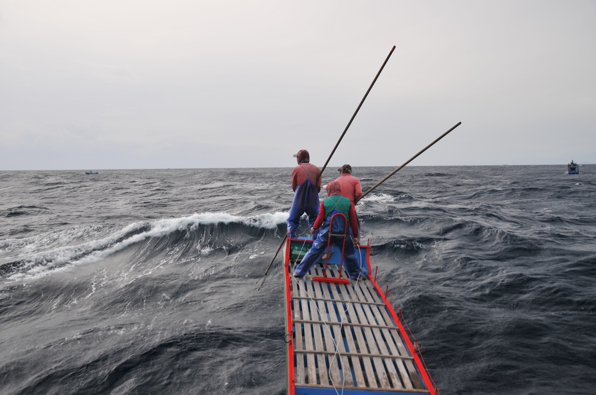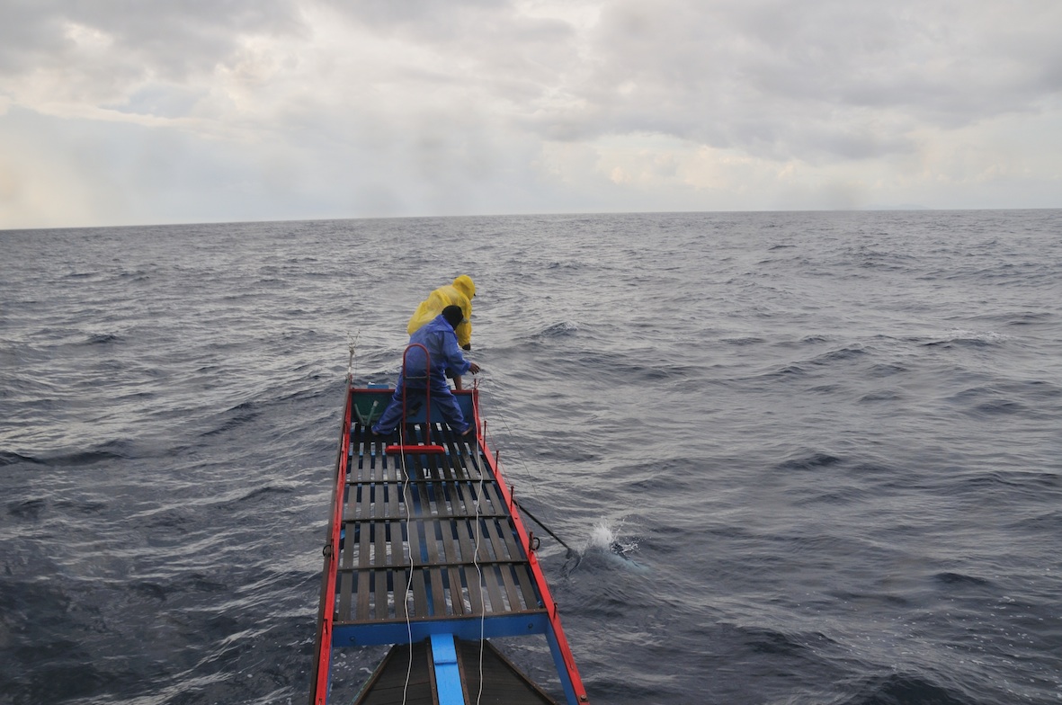 結束一天的鏢魚作業,返航途中大夥兒輕鬆一下,抽根煙,慶賀一天的豐收。
