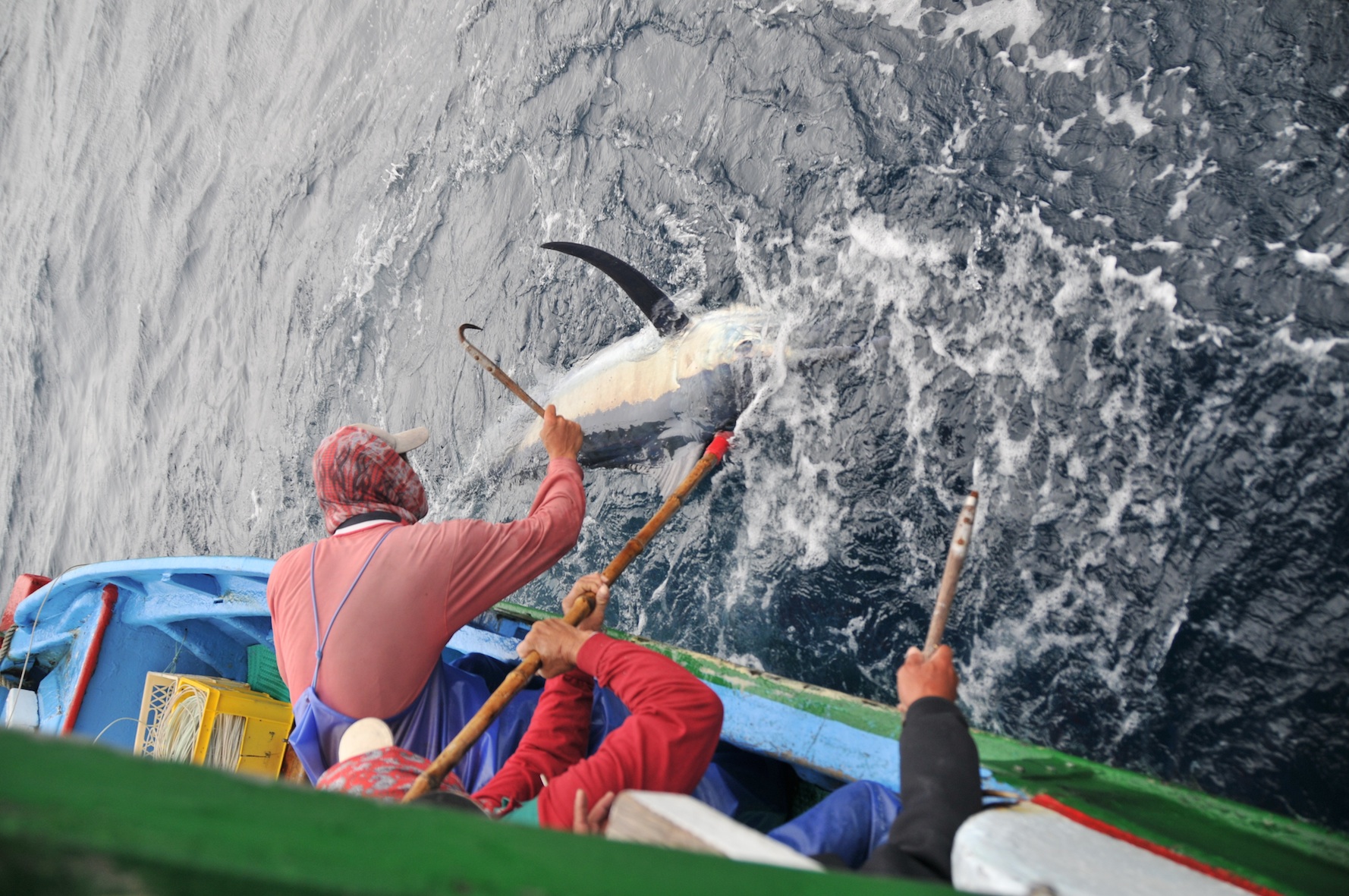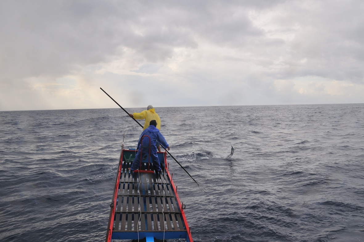又一次落鏢中的!把高價值的白肉旗魚拉近船身,準備齊力拉上鏢魚船。