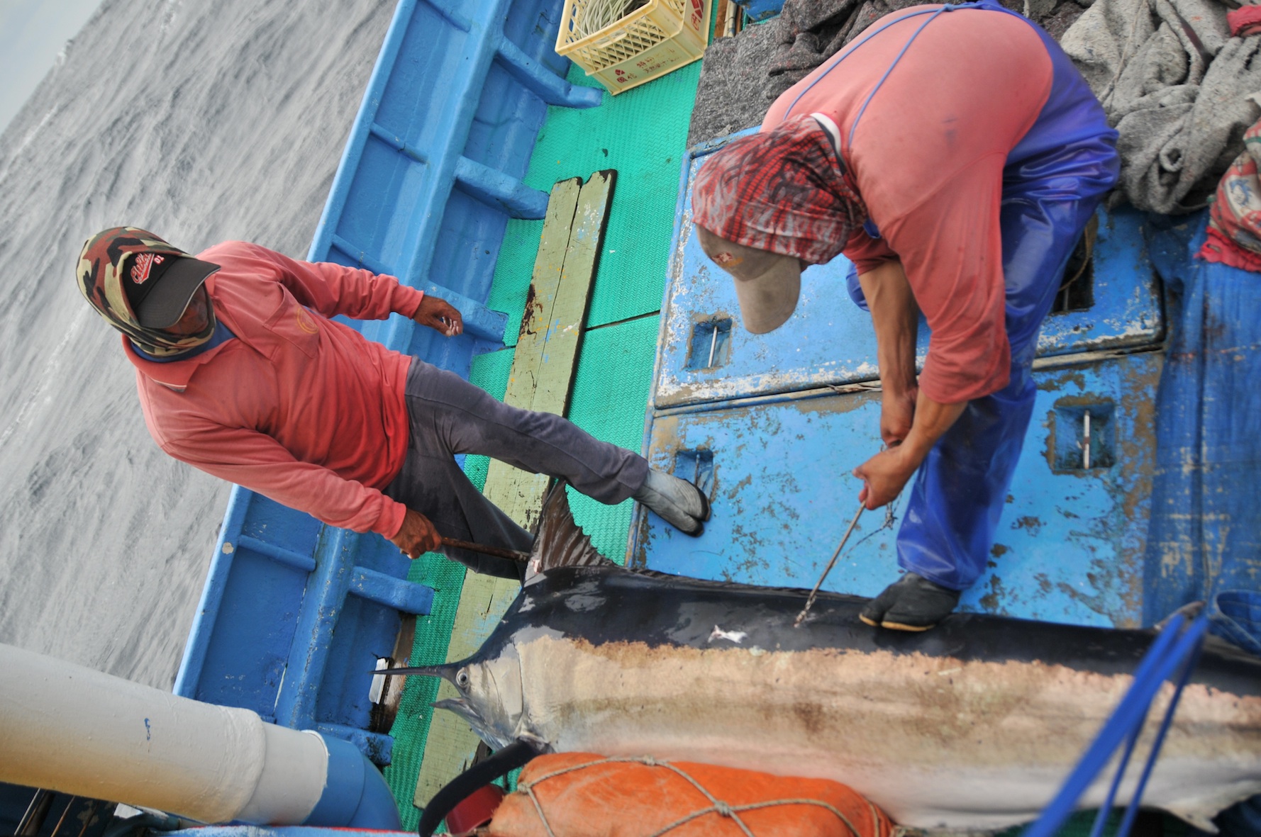 白肉旗魚安置妥當,外號「幼齒」的年輕鏢手蹲跪在船板上,用力拉出深入旗魚背部的倒鉤。