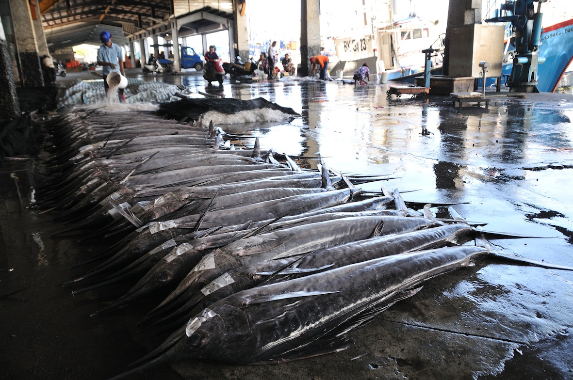 魚市場一排一排的旗魚,待價而沽。如今這種豐收的景象,只有在台東縣成功漁港才能看到了。