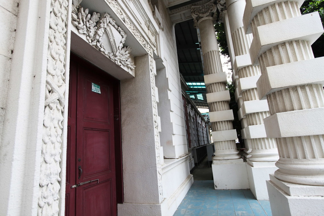 三角形山牆處理則甚為簡單,內無裝飾,開眉形窗一座,挑簷之下與屋楣部份則均有珠飾處理。穿過門廊則為次入口,門罩處理與正門類似,但無勳章飾,其上則有小窗一座,由二根托次坎短柱分割,天花部份則為格子樑形式,亦作藻井處理。
