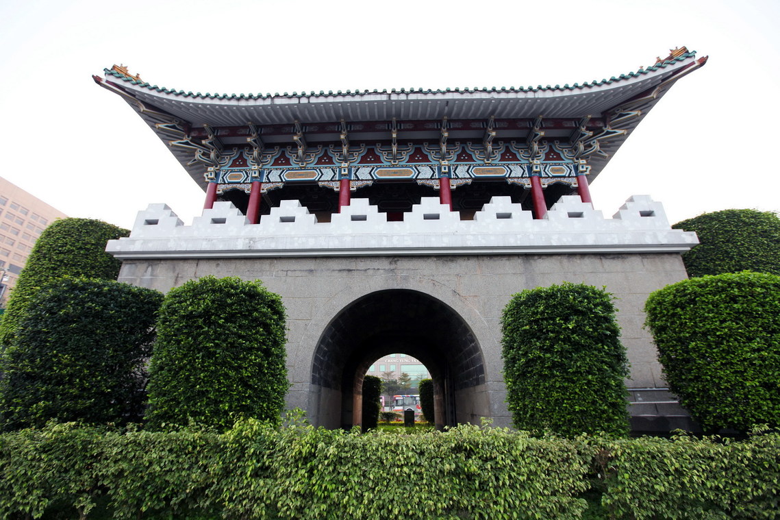 台作雖也是石條所砌,上半部卻使用傳統上常看到的柱廊樓閣。屋簷下斗拱成列,並施彩繪,有如一座小廟,非常華麗。門額題為「重熙門」意為盛世興隆,光輝普照的意思。