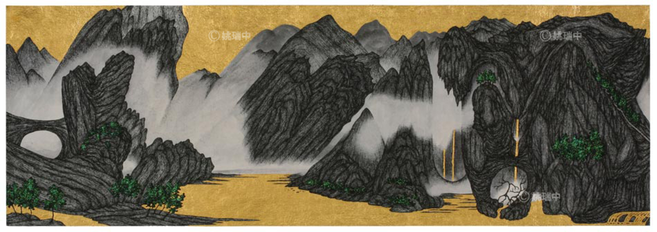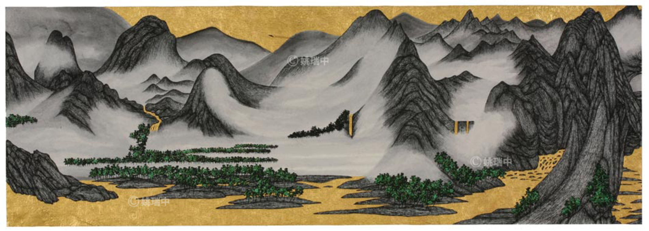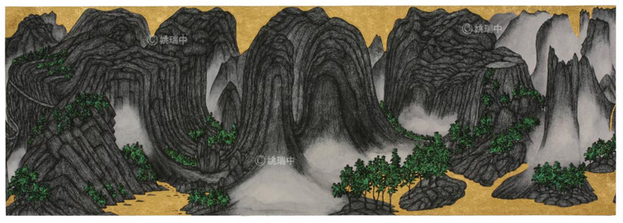 雲遊圖 手工紙本設色, 墨水, 金箔 135×46cm 8連拼 2009
