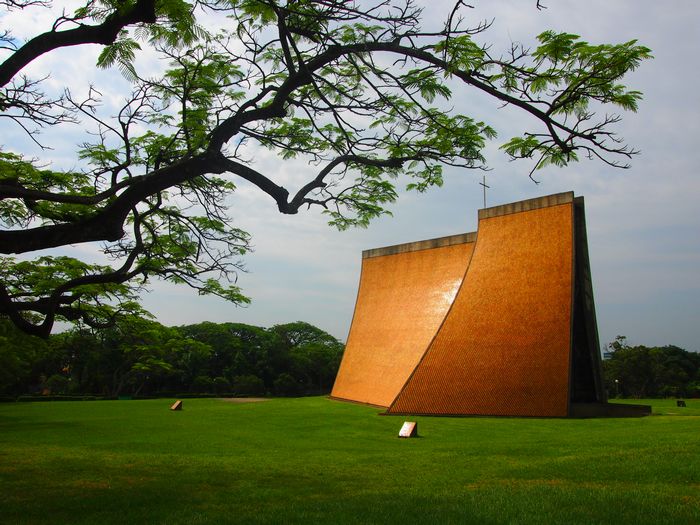 東海大學路思義教堂,座落於東海大學的活動中心與教學區之間碧草如茵的廣大草皮上,路思義教堂是由最負盛名的建築師貝聿銘所設計。 |