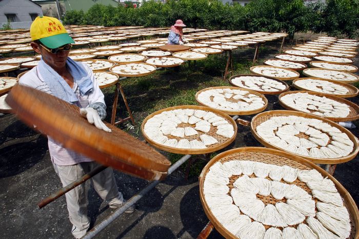 台南關廟知名的特產除了鳳梨以外,還有一項那就是關廟麵。這麵線純採手工製作,店家將一盤盤的麵線放置在廣場上曝曬,還要不時的翻面作業,充滿人文的美感。 |