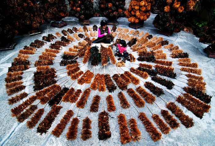 以前家裡很普遍的雞毛撢子,現在已經很少見,用手工將雞毛一根根黏上,非常辛苦。但將雞毛撢子排成一圈後,取景按快門,卻形成好壯觀的景象,只能說來這裏拍照,超幸福的呀! |