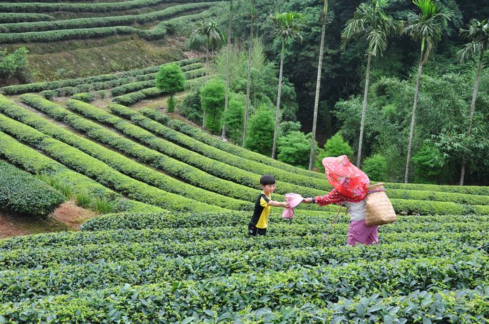 蘆峰烏龍茶位於桃園蘆竹鄉,屬溫和多霧的林口台地,這裡的土質非常適合茶樹耕作,因此誕生了遠近馳名的蘆峰烏龍茶,當時的拍攝現場,正好是一片深綠色茶園襯托下,民眾與家人互動的溫馨畫面。 |