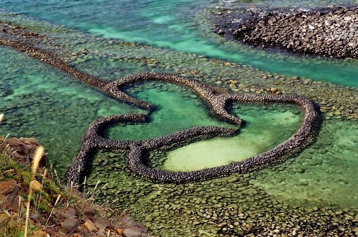 雙心石滬位於澎湖縣七美鄉,是利用玄武岩及珊瑚礁在潮間帶築成的捕魚石牆,也是一種海中陷阱,而這個特殊景觀,也為這美麗的島嶼,記錄下永恆的浪漫傳說。 |