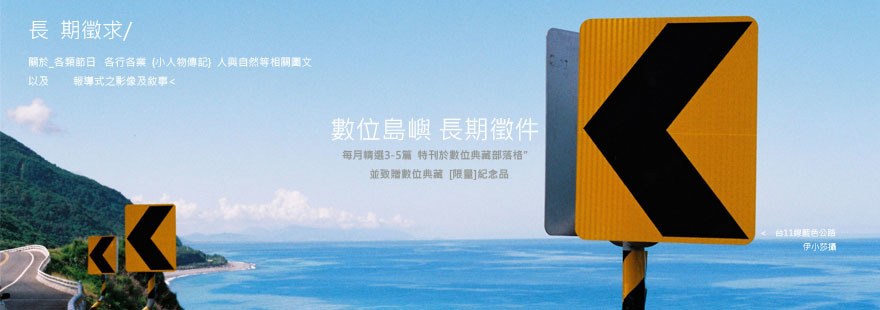 數位島嶼長期徵求關於 (1) 各類節日 (2) 各行各業 (3) 小人物傳記 (4) 人與自然 等主題的圖文,以及報導攝影式之影像與敘事。