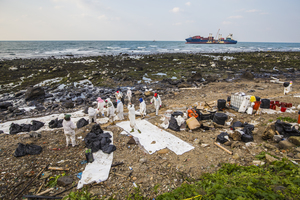 3月10日德翔臺北貨輪擱淺在新北市石門海域,船上重油隨著潮汐擴散到周遭海域及海岸,導致生態嚴重受到破壞,以及金山重要文化資產蹦火仔都補不到魚,當地居民穿上防護衣,投入清理自己的家園及海岸線。