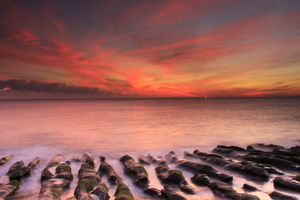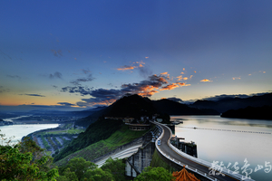 內容描述(約50-200字) : 日出前石門水庫壩頂,霞光四射火燒雲,遠處可以看到雲海的變化。