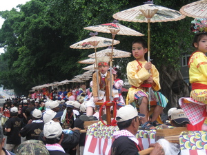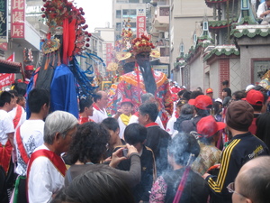 每年農曆五月十九日,是舊金城「城隍爺」的生日,當地善男信女在這一天舉行盛大廟會活動,來自各地的信徒紛紛湧入舊金城,真是個熱鬧異常,不久,巡行隊伍開始囉!隨侍在城隍爺身旁的七爺與八爺,更是巡行隊伍最具看頭的。照片中的七爺(薛將軍),正整裝待發,但七爺按捺不住性子,直說要出發,但是服裝還未完整,七爺!再等一下嘛。