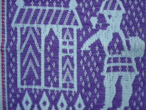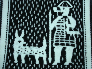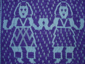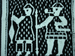 賽德克族編織沐浴於春陽-運用傳統技法〈浮織與挑織〉-婦女打小米圖像〈Dmikan hlama〉,其材質為工業用棉線。
