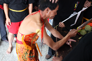 D.照片說明:童乩穿完銅針後,踩著王公神轎出巡。被王公選中的童乩,就是王公這一年在民間的代言人,舉凡廟方事務、社區重大公共事務,童乩都要參與,代表王公發表意見。
