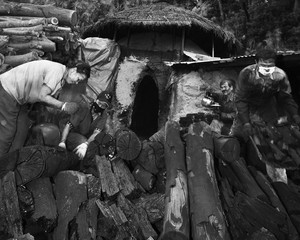 在窯外也是成堆的木材需再撬成小塊及區分與包裝!